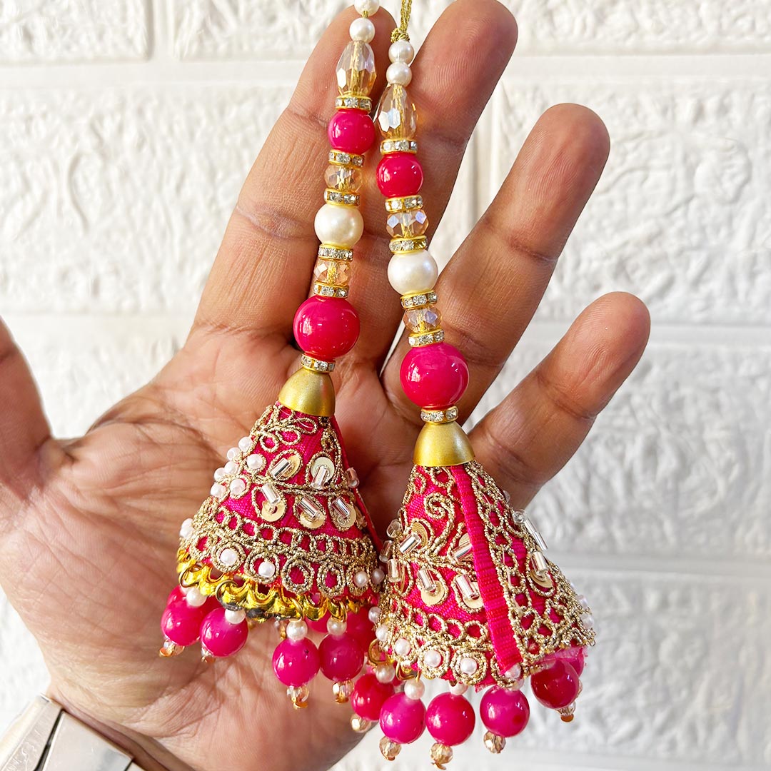 Each tassel features a beautifully shaped cone bead design, enhanced with carefully selected beads that create a graceful drop and subtle movement. The cone structure gives the latkan a rich, finished look, making it an ideal embellishment for both festive and everyday ethnic wear. Whether you are styling a bridal lehenga, upgrading an old saree, or adding detail to a designer blouse, these tassels bring instant elegance.