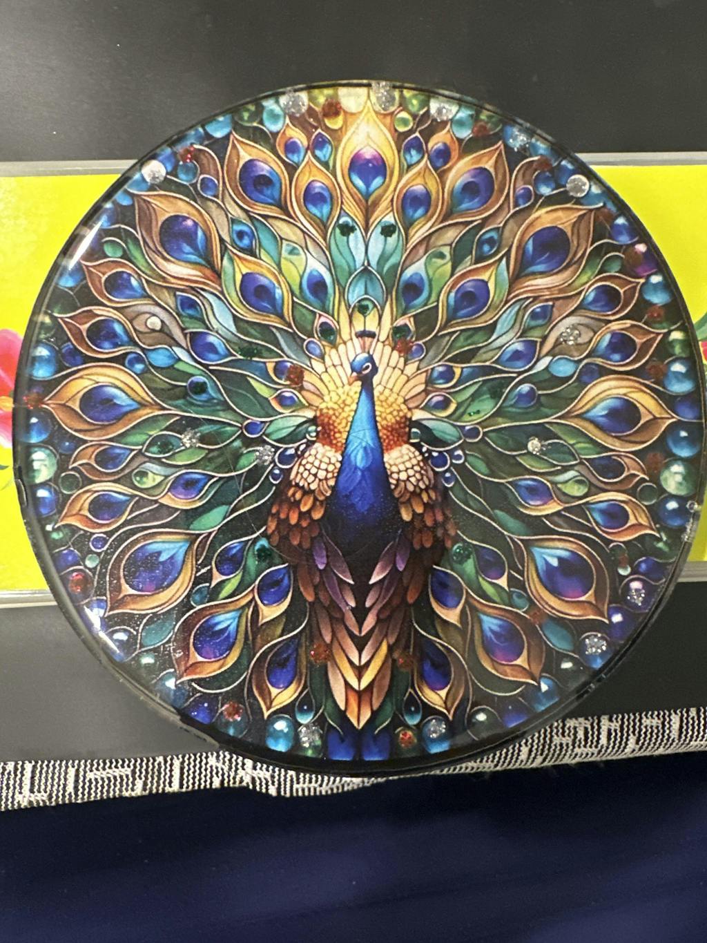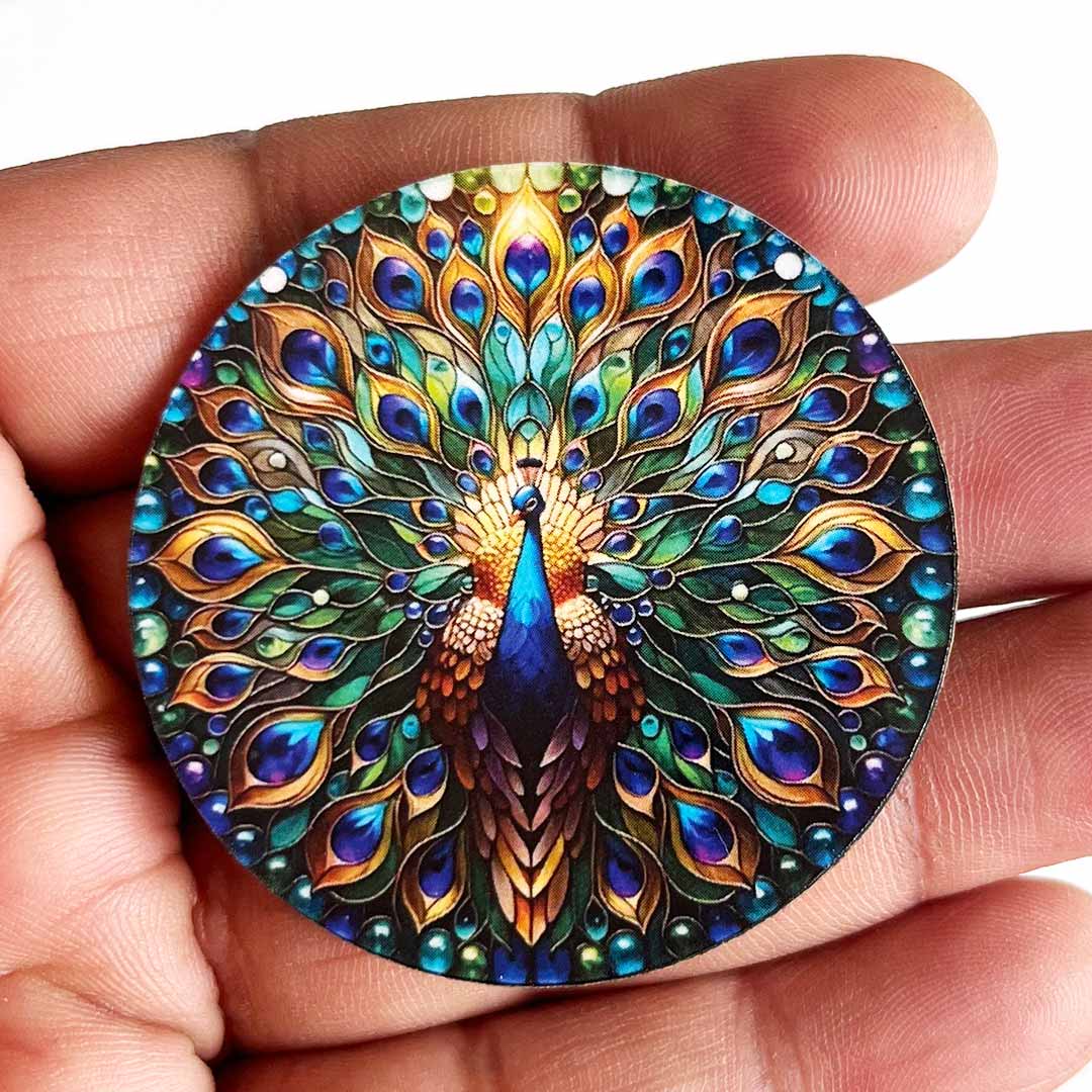 Design: Traditional round cutout featuring an elegant multicolor peacock motif – symbolic of grace, prosperity, and divine protection.